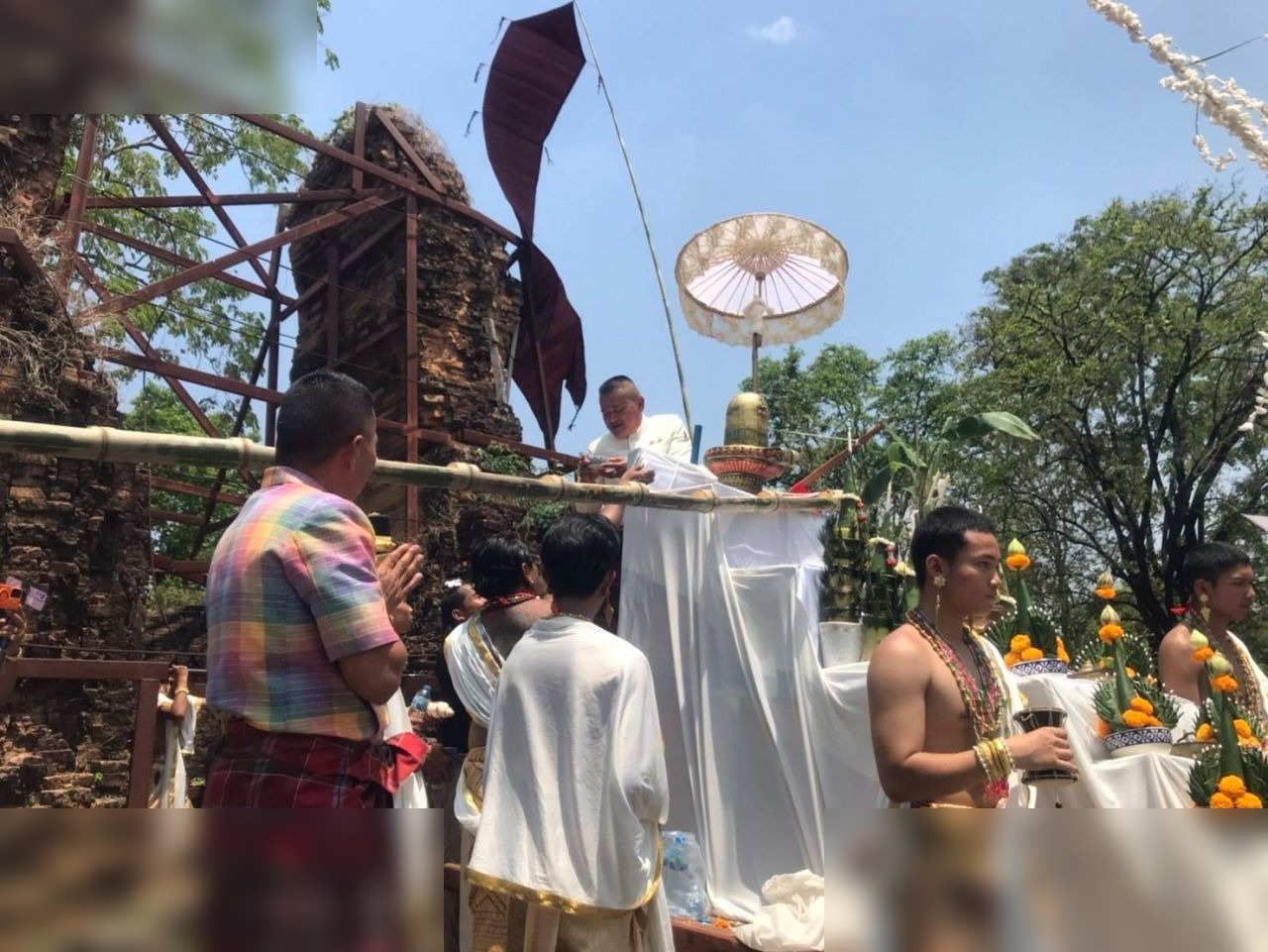 ชาวบ้านในพื้นที่และต่างจังหวัดเดินทางมาร่วมพิธีบวงสรวงที่ปราสาทมีชัย ซึ่งตั้งอยู่ในเขตอำเภอศีขรภูมิ แม้สภาพอากาศช่วงเวลานั้นจะร้อนจัดจนแทบจะไม่สามารถทำกิจกรรมกลางแจ้งได้นาน แต่แรงศรัทธาของประชาชนกลับไม่ลดละลงเลยสักนิด นักท่องเที่ยวและชาวชุมชนต่างพร้อมใจกันสวมใส่เสื้อผ้าที่สุภาพ พร้อมเครื่องสักการะเพื่อขอพรจากสิ่งศักดิ์สิทธิ์ที่สถิตอยู่ ณ สถานที่แห่งนี้