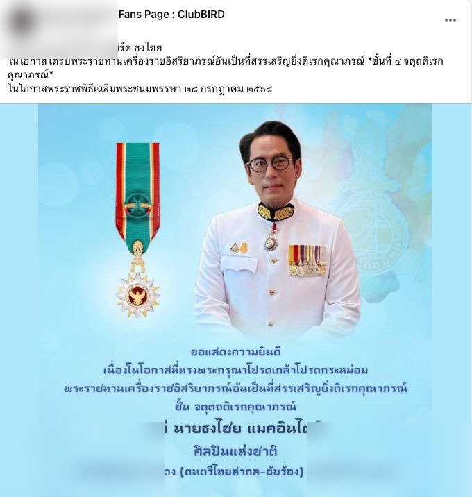 เบิร์ด ธงไชย รับพระราชทานดิเรกคุณาภรณ์ ชั้น 4 แฟนคลับร่วมแสดงความยินดี