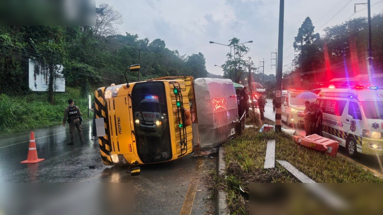 เจ็บ 7 ราย! รถหกล้อแขวงการทางแม่สายเสียหลักชนเกาะกลางพลิกตะแคง
