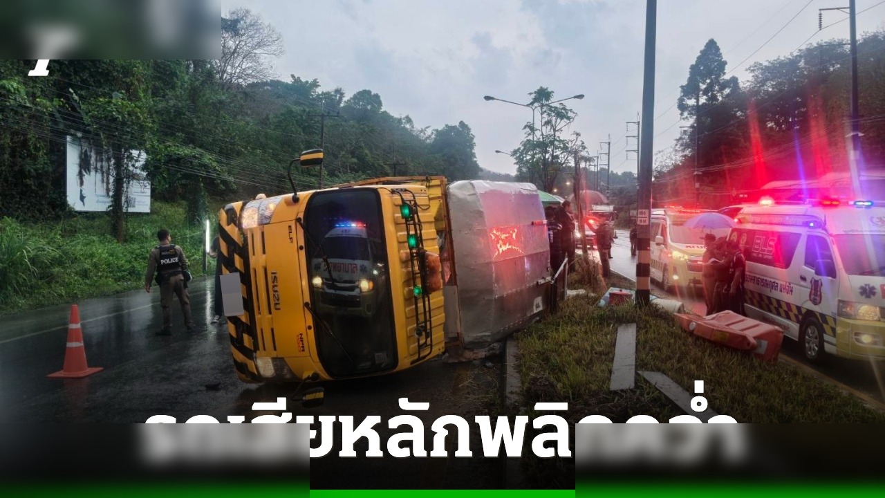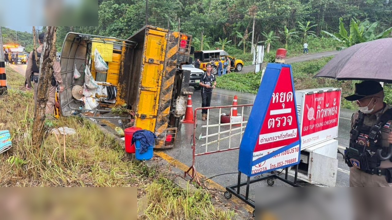 เจ็บ 7 ราย! รถหกล้อแขวงการทางแม่สายเสียหลักชนเกาะกลางพลิกตะแคง