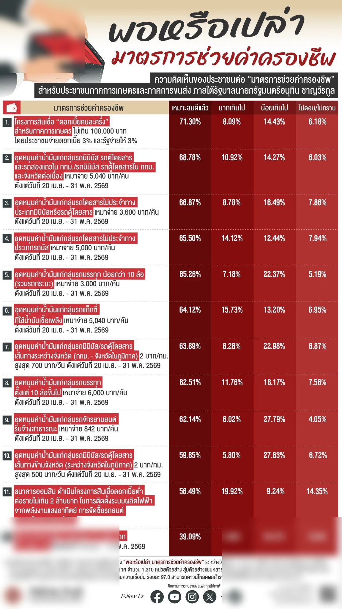 มาตรการช่วยค่าครองชีพ “รัฐบาลอนุทิน” โพลชี้เหมาะสมดีแล้ว แต่เพิ่มเงินบัตรคนจนน้อยไป
