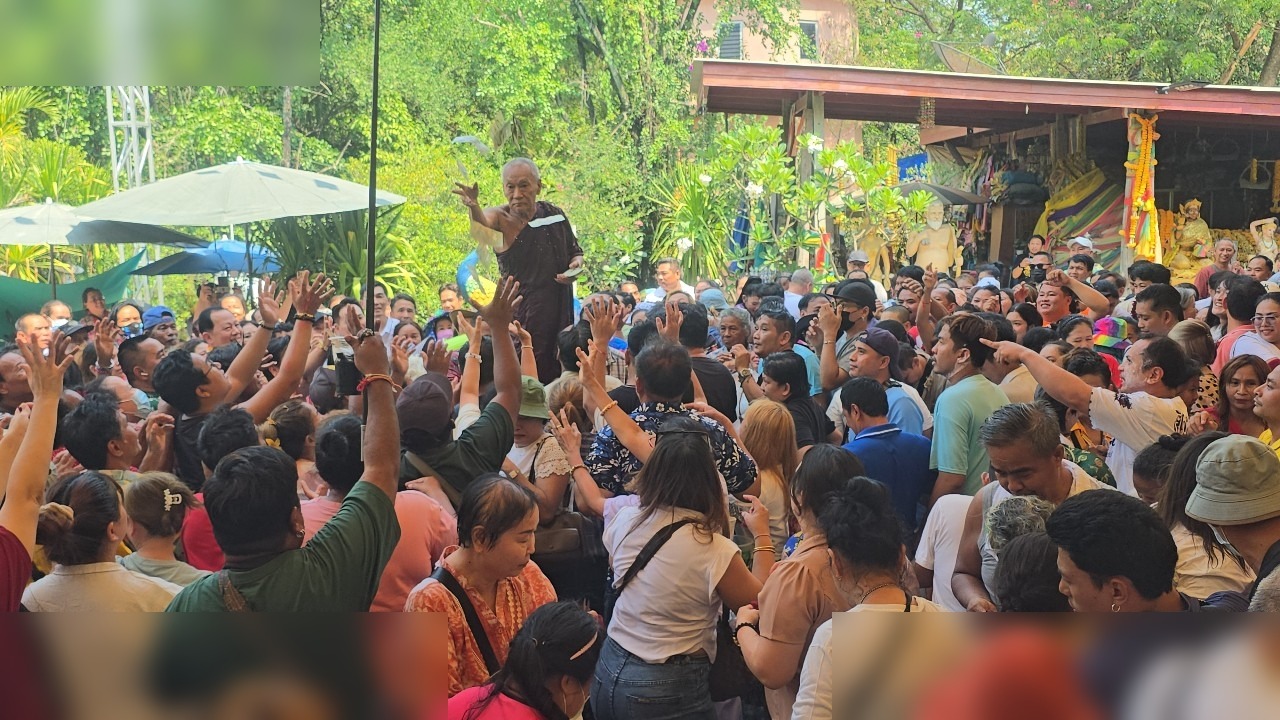 คอหวยแห่ส่องเลขเด็ด หลวงพ่อแป๊ะ วัดสว่างอารมณ์ จีวรบินแจกธนบัตรรับโชค